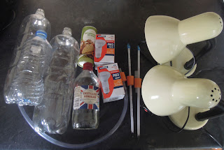 TIP: You need to make sure that appart from their contents the bottles are identical. Have them the same distance from the lamps and make sure the thermometers are the same depth in the bottles.